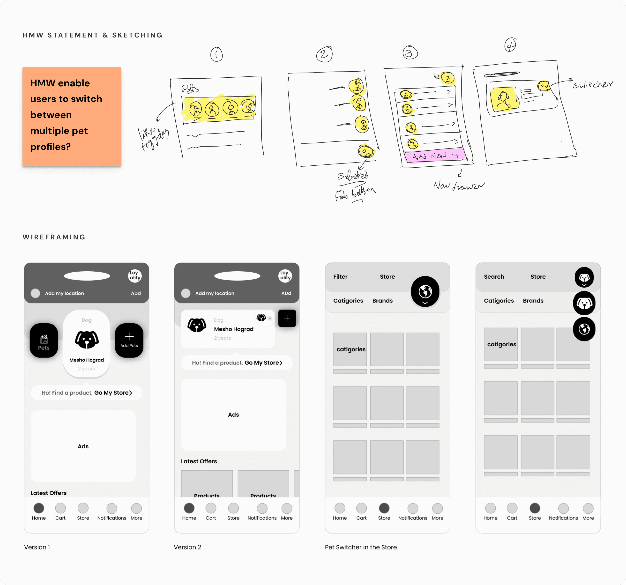 Two key concepts were incorporated: switching between pets directly from the homepage, and a fixed navigation element that remains accessible throughout the app.