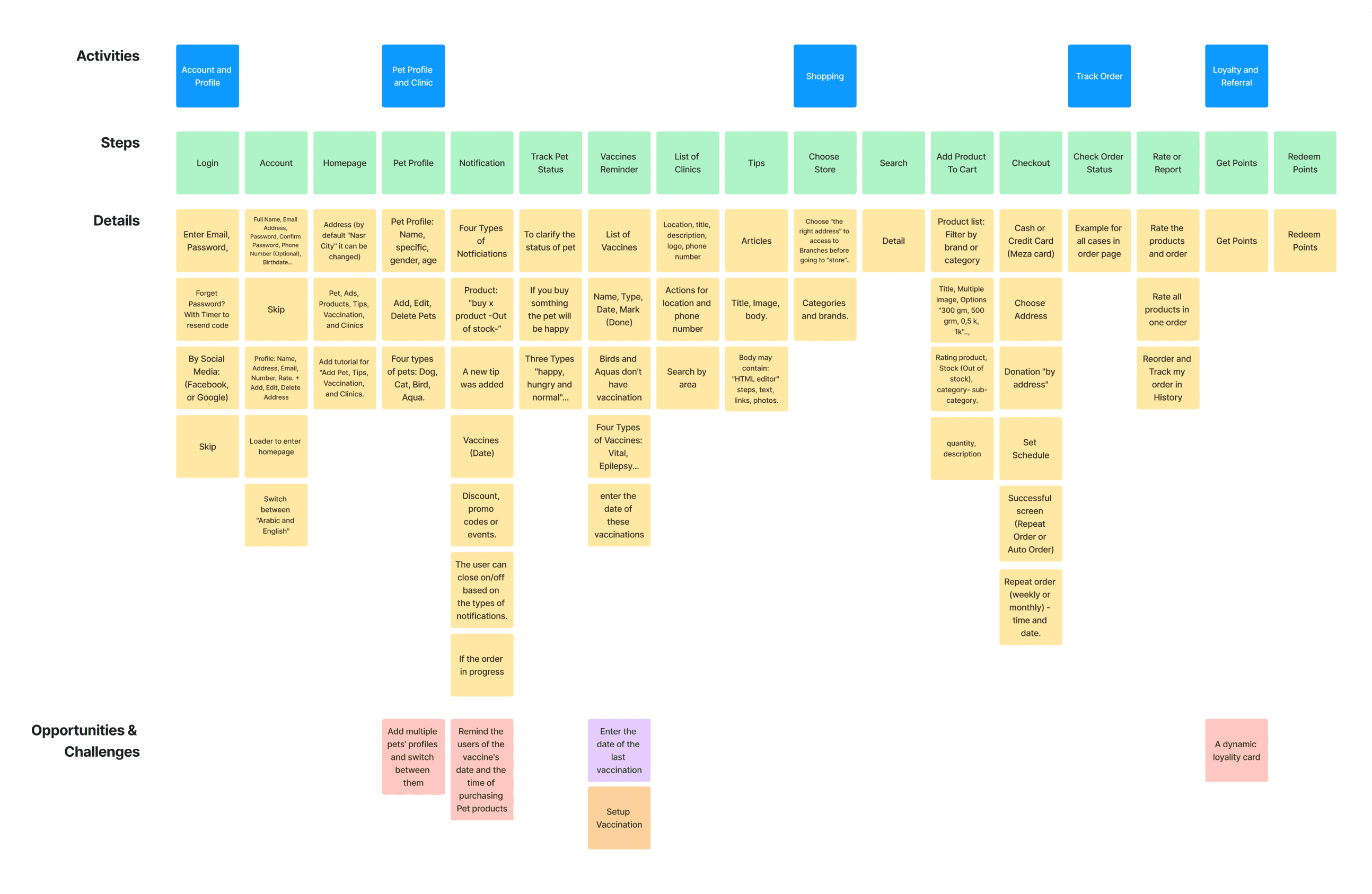 I transformed these notes into user stories using a product story map, and categorized the requirements into phases and breaking them down into actionable steps. This process allowed us to identify and explore the features, challenges, and opportunities associated with each phase.