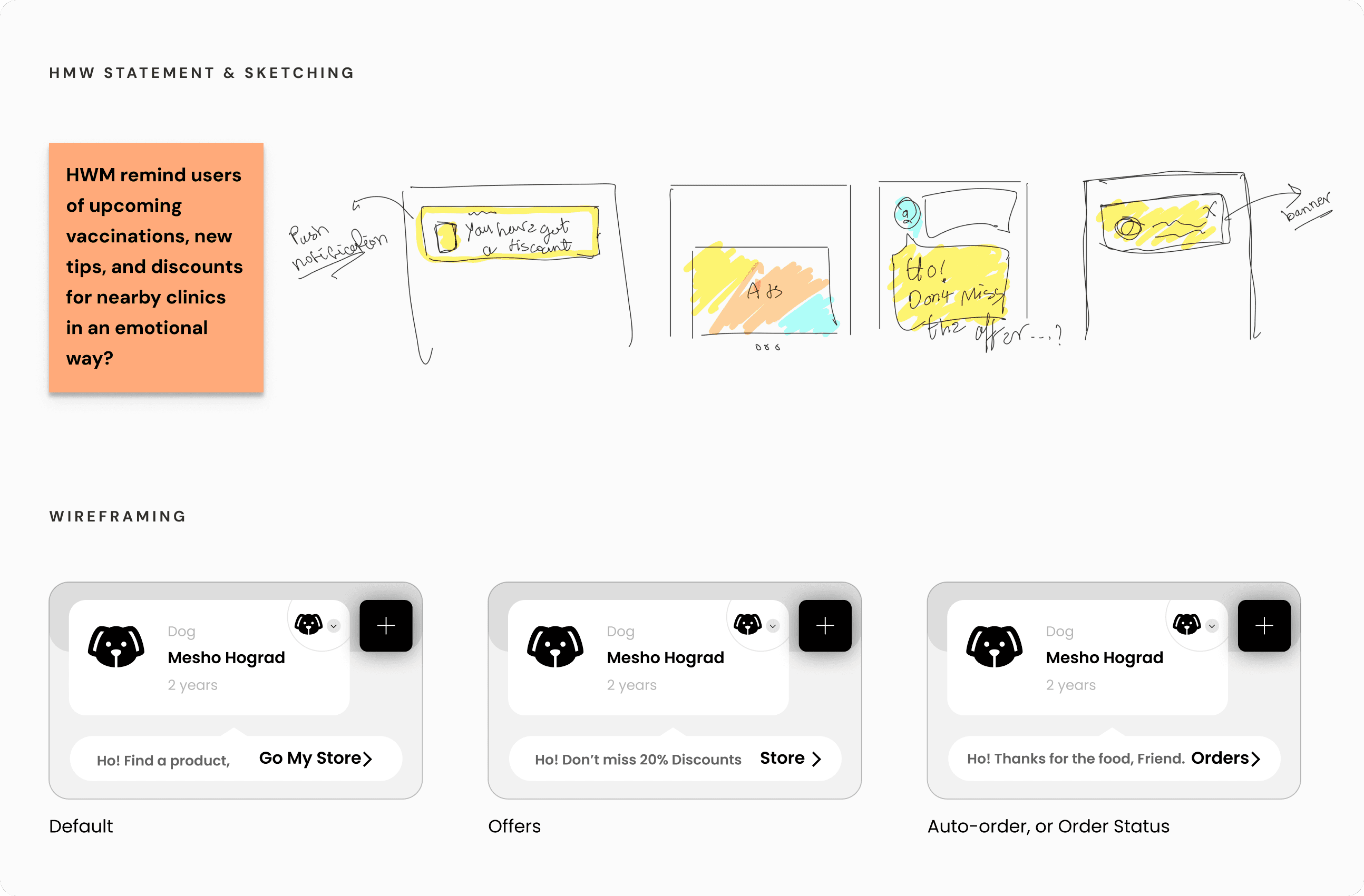 I sketched multiple ideas, and the one that resonated most with the team was the use of dialog boxes beneath the pet profile switcher, which communicated the pet’s "emotions" through emojis: